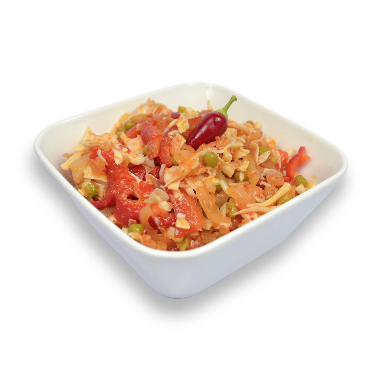 sýr Eidam, paprika, cibule, okurky, řepkový olej, feferony, hrášek, kapie, cukr, sůl, pepř