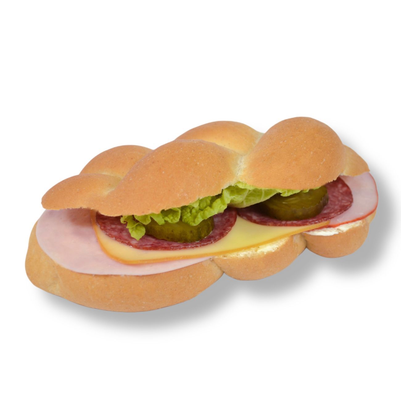 bun, butter spread, fresh Chinese cabbage, Debrecen sausage, stewed ham, tourist salami, sterilized cucumber