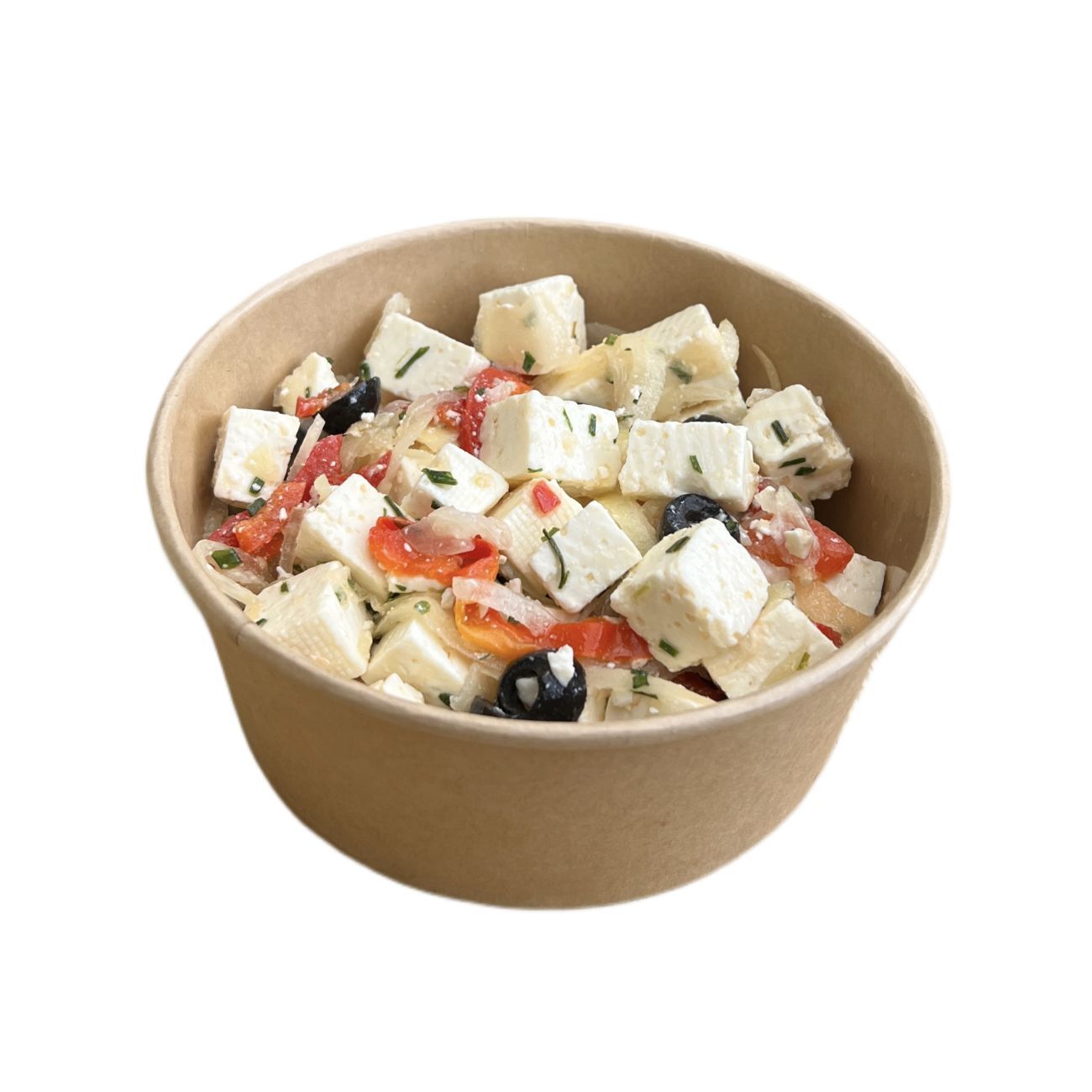 Balkánský sýr, cibule, rostlinný olej, kapie, černé olivy, pažitka