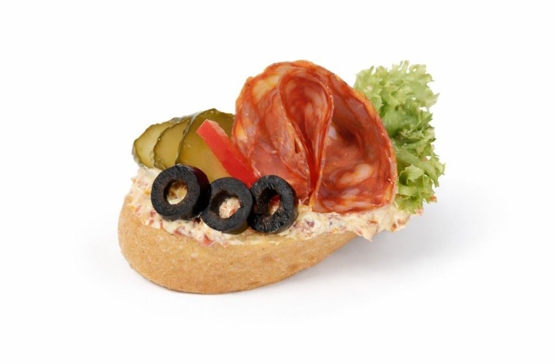 Pomazánka chorizo, bageta světlá, chorizo, okurka sterilovaná, černé olivy, lolo salát, kapie sterilovaná.