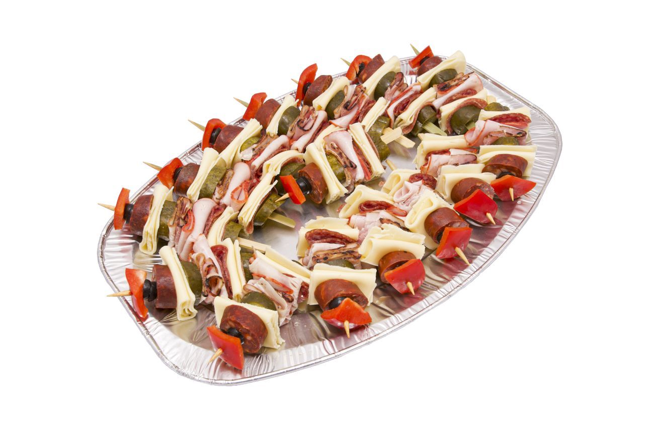 klobása, sýr Eidam, anglická slanina, čerstvá cibule, salám Turista, Poličan, okurka, čerstvá paprika, olivy