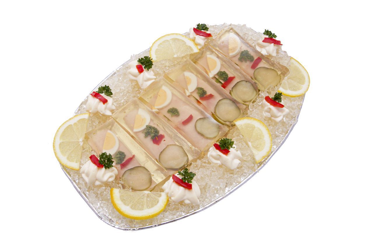 šunkové závitky v aspiku, čerstvá okurka, citrón, petržel
