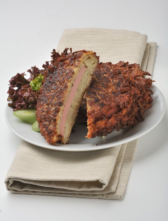 smažené bramborákové těsto, výrobní salám, majoránka, sůl, pepř